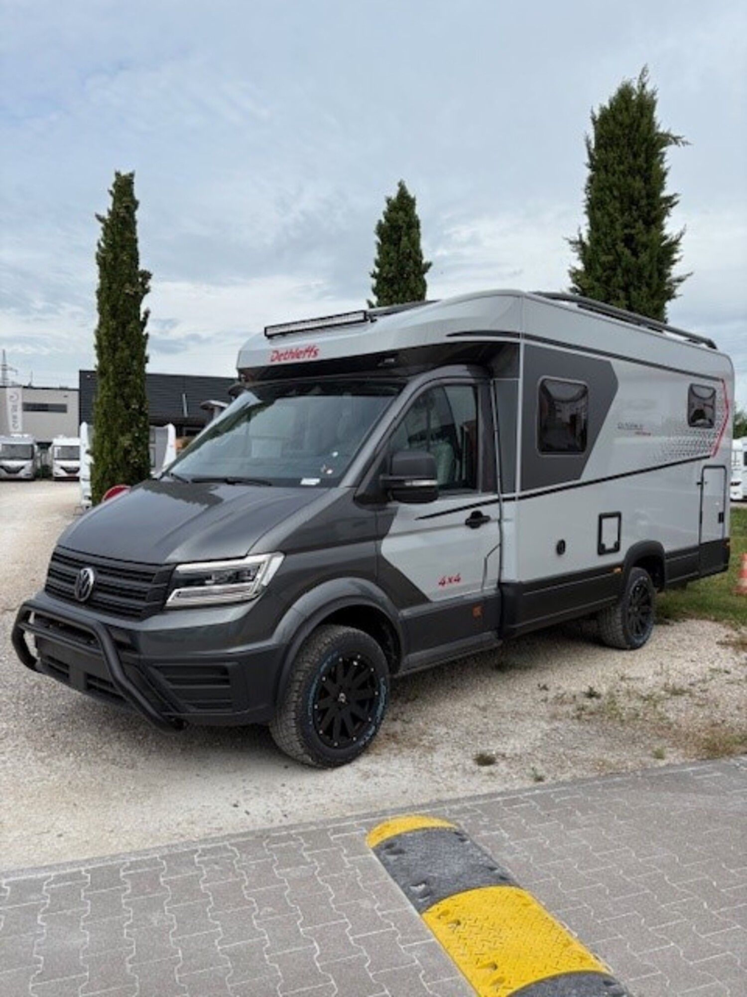 • Serienausstattung Globebus Performance (Außenfarbe Indium-Grau Metallic, Luftfederung Hinterachse mit Differenzialsperre, Vorderachse verstärkt (Achslast 2.100 kg), Höherlegung des Fahrwerks um 50 mm, LED Hauptscheinwerfer mit LED-Tagfahrlicht, 18? Felgen Hanma matt schwarz, 255/55 R18 118 T Loderreifen (M+S Schneeflocke), Navigationssystem Discover Pro mit 32 cm (12?) Touch-Farbdisplay, Multifunktions-Lederlenkrad mit Tiptronic, Digitales Cockpit Pro, Klimaanlage AirCare Climatic, Elektrische Parkbremse, Assistenzpaket Advanced inkl. automatischer Distanzregelung (ACC), intelligent Speed-/Travel-/Lane-Assist, u.v.m., Verkehrszeichenerkennung, Bergan-/-abfahrhilfe, Drehsitze links/rechts mit Armlehnen, Außen-Ausstattung, Außendesign First-Edition mit charakteristischen ShapeLine LED-Heckleuchten, Lifetime Smart Aufbaukonstruktion mit GFK-verkleidetem Unterboden, Rahmenfenster, Aufbautür 70 cm inkl. Fenster, Zentralverriegelung und Fliegengittertür, Alu-Riffelblech in der Heckgarage, Türen links und rechts mit Einhandbedienung, Scheinwerfer (LightBar) auf der Fronthaube, Leiter und Dachreling schwarz, Markise schwarz inkl. LED Band (Vorzeltleuchte), Innen-Ausstattung, Tisch Sitzgruppe mit schwenkbarer Erweiterung, 7-Zonen EvoPore Matratzen (15 cm dick) auf ergonomischen Holzlattenrosten, Bettenumbau Einzelbetten zu Doppelbett, Dachschrankhinterlüftung AirPlus zur Vermeidung von Kondenswasserbildung, Dachlüfter mit Ventilator an der Küche, Installation, SCU lite: Steuerung von Kühlschrank/Heizung per Handy-App, Indirekte Beleuchtung (Dachschränke, Wand Sitzgruppe, Küchenrückwand, Heck quer (offene Ablage)), 32? TV Smart inkl. Halter, CamperNet Router mit Dachantenne.)