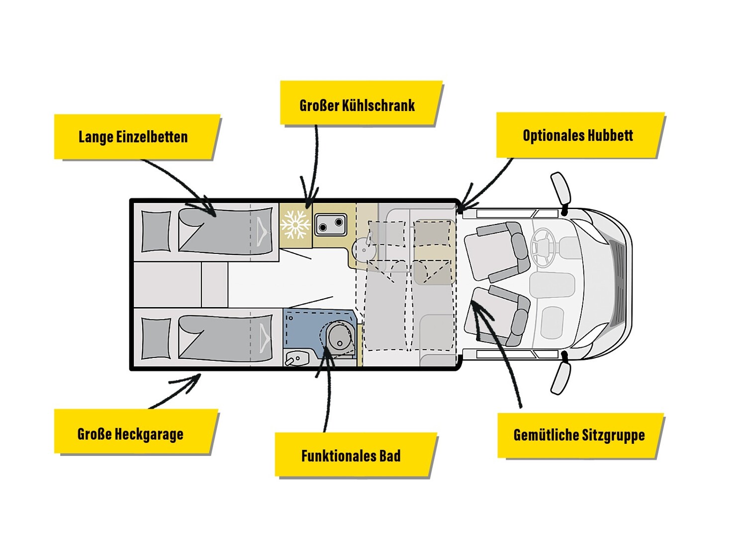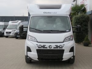 - Serienausstattung Glücksmobil (Zenec Navi inkl. DAB+ und Truck Navigation, Rückfahrkamera (einfach, Rahmenfenster inkl. Küchenrückwand, Cassettenmarkise 4,0m manuell, 16 Zoll Alufelgen, Aufbautüre mit Fenster und Zentralverriegelung, Verdunkelungsjalousien im Fahrerhaus, Panorama-Dachhaube 70x50cm im Wohnraum, L-Sitzgruppe, Garagenklappe links, Indirekte Beleuchtung, Indirekte Gardinen-Beleuchtung o. Dimmung, CP Plus, Duschrost, Vorb. Solaranlage, Vorb. Dach-Klimaanlage, Ausstellfenster in der T-Haube, Küchenrückwand beleuchtet, Wohnwelt Heron, GT Abklebung, Bettenumbau EB zu DB, Glücksmobil Beklebung)