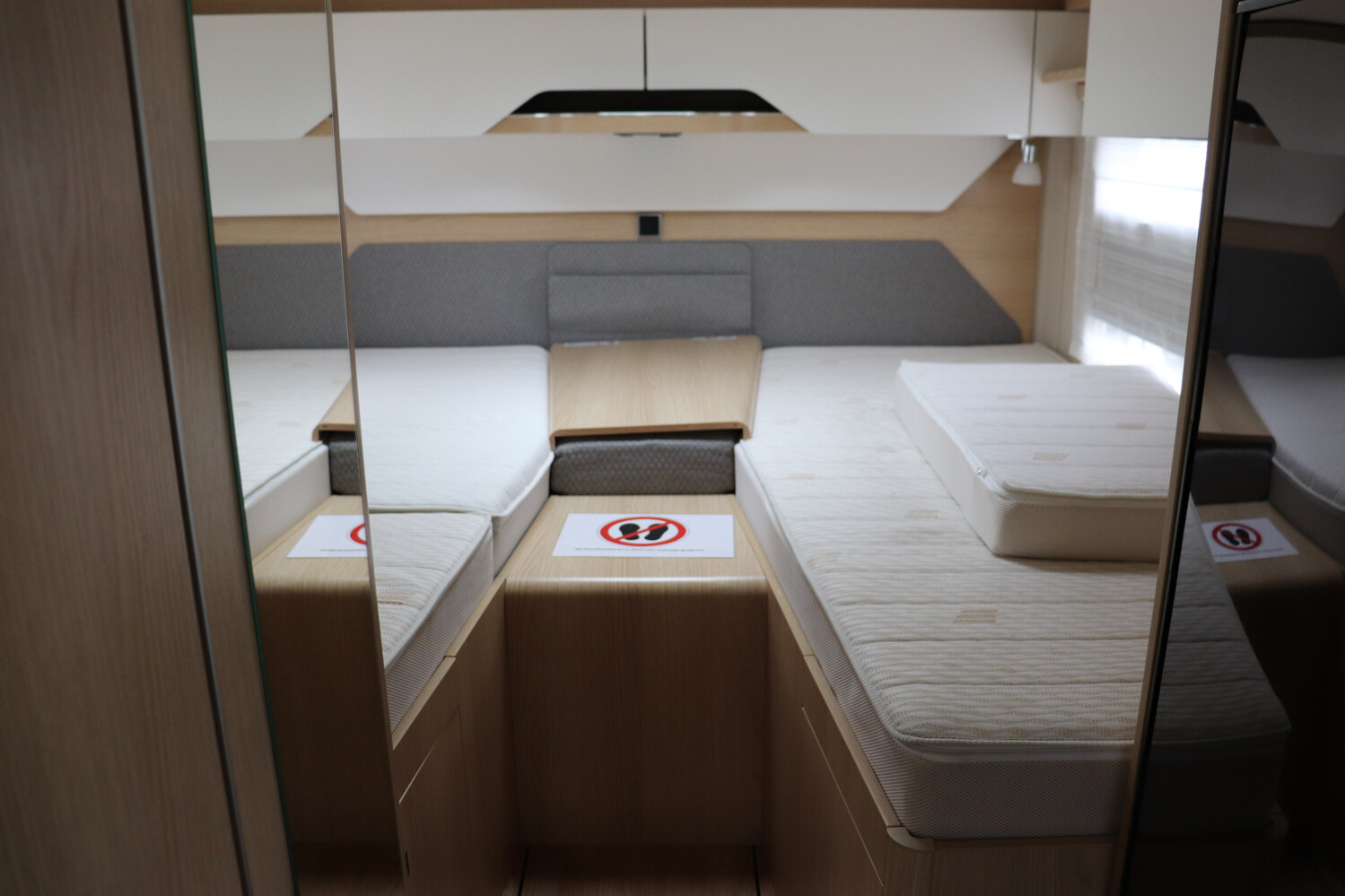 • Komfort Plus-Paket 5 (Fliegenschutzrollo an der Eingangstür, Panoramadach über Fahrerhaus, manuell ausstellbar, Fenster mit Verdunkelungsrollo und integriertem Mülleimer in Eingangstür, Faltverdunkelung für Fahrerhaus, Schublade und Einlegewanne als Stauraum in der Sitzgruppe)