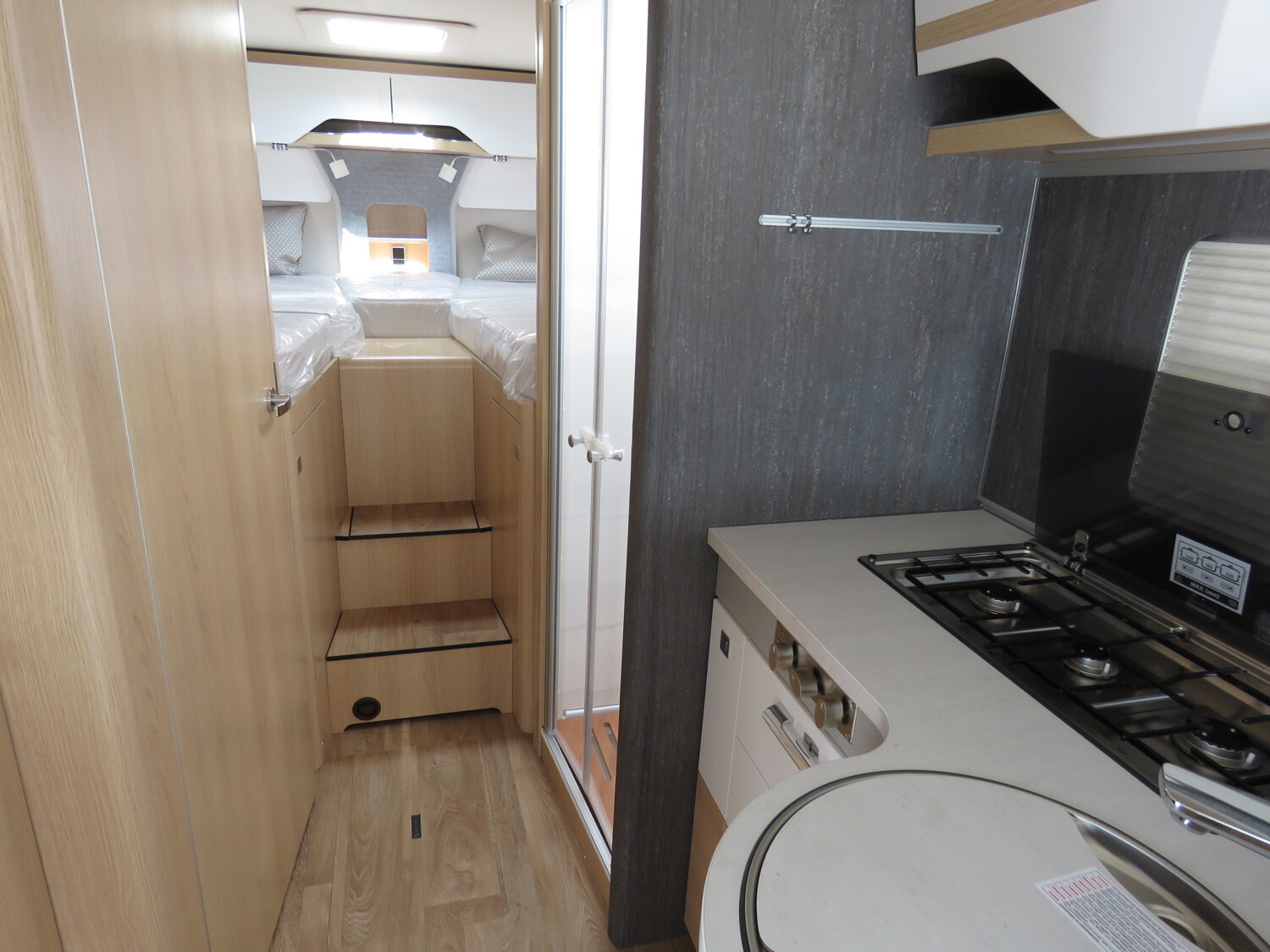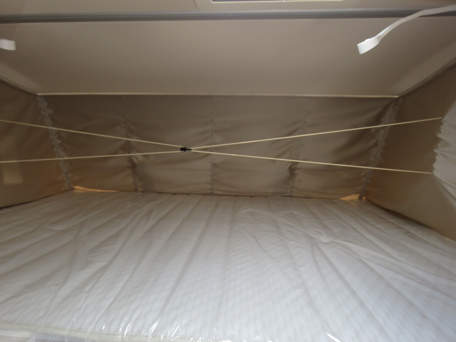 - Wohnkomfort-Paket (Einlegeboden mit Holzoberfläche, 4 x 230 V / 1 x 12 V / 1 x Doppel-USB Zusatzsteckdosen sowie Wohnkomfortleuchten, Spannbettlaken nach Maß für Heckbetten individuell an Matratzen angepasst, 4 Kissen mit Bezug)