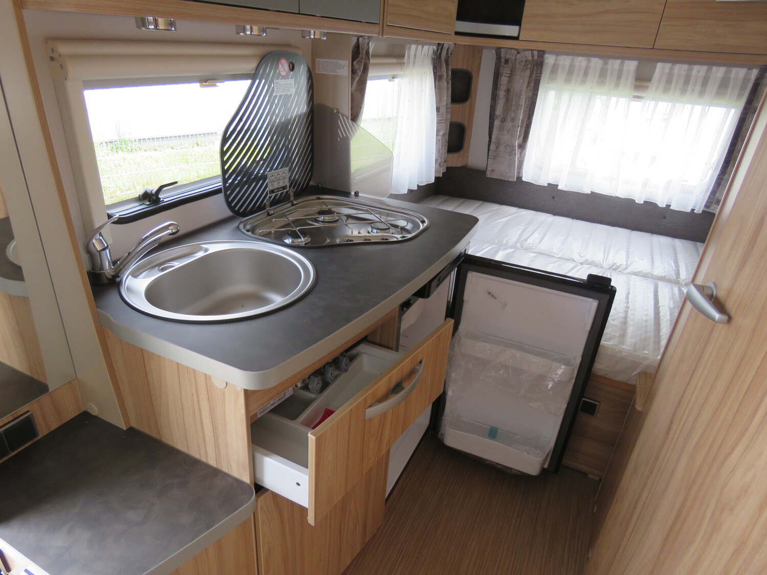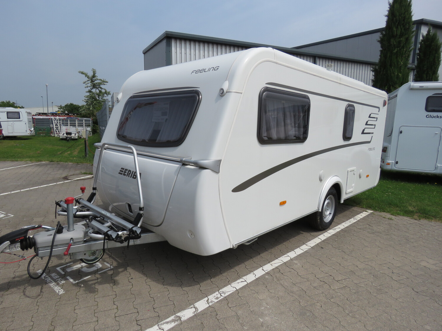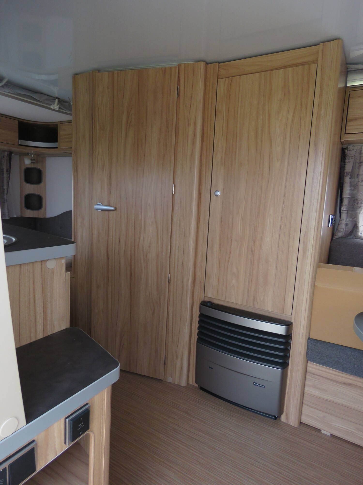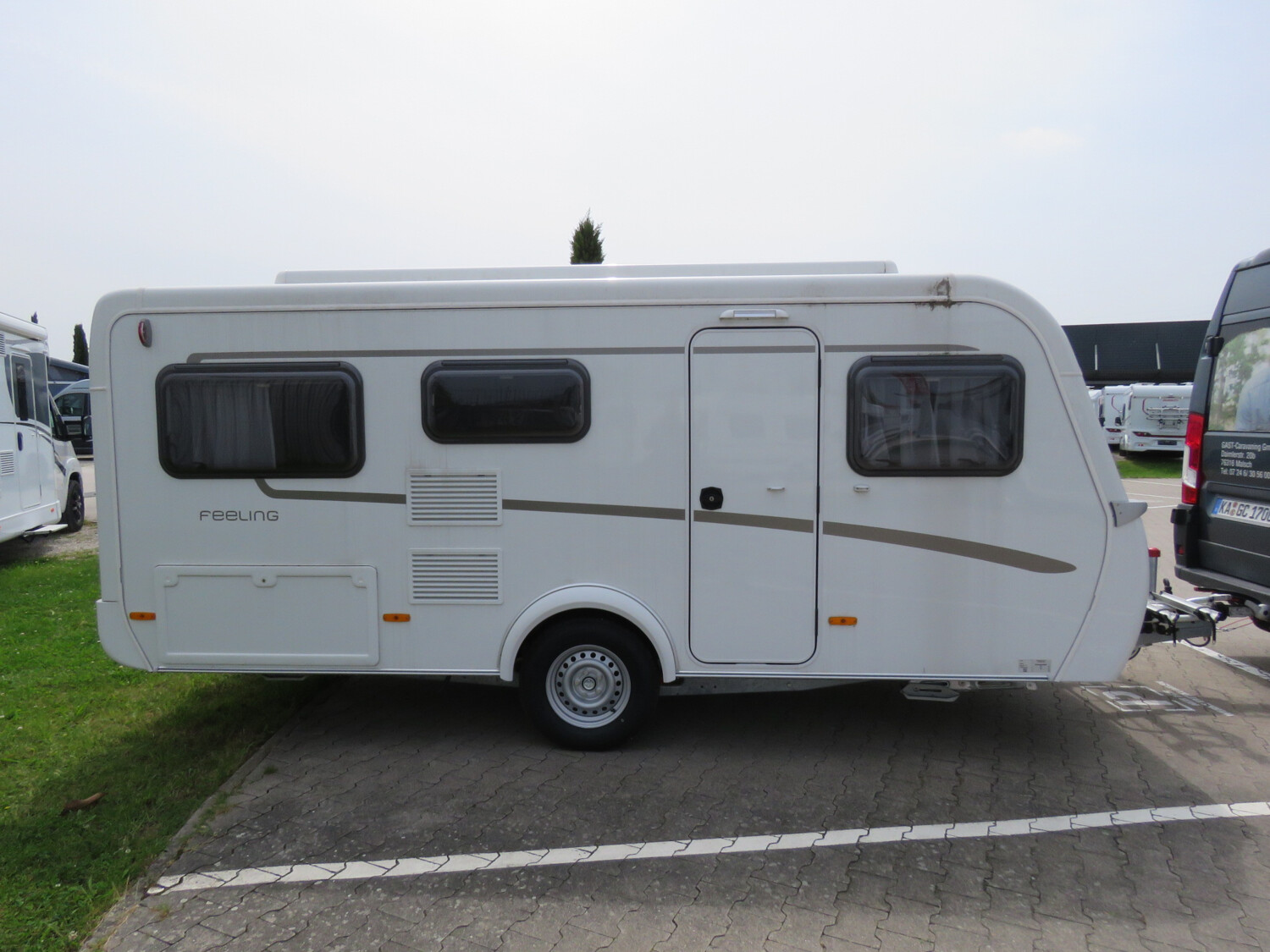 - Moving-Paket (Autarkpaket (95 Ah AGM-Aufbaubatterie, Ladegerät mit integriertem Booster), Fliegenschutz-Rolltür (gesamte Türhöhe), bedienfreundlich durch seitliche Führung, Deichsel-Fahrradträger Thule Caravan Superb für zwei Fahrräder, max. Traglast 60 kg (für E-Bikes geeignet), Abstützfuß (4 Stk.) für Caravanstützen: Verhindert Einsinken oder Wegrutschen der Stützen, Deichselstützrad mit integrierter Stützlastanzeige, 22 l Abwassertank, rollbar (Unterbringung im Gaskasten), Steckdosenpaket (2 x 230 V Zusatzsteckdosen im Wohnraum und in der Küche))