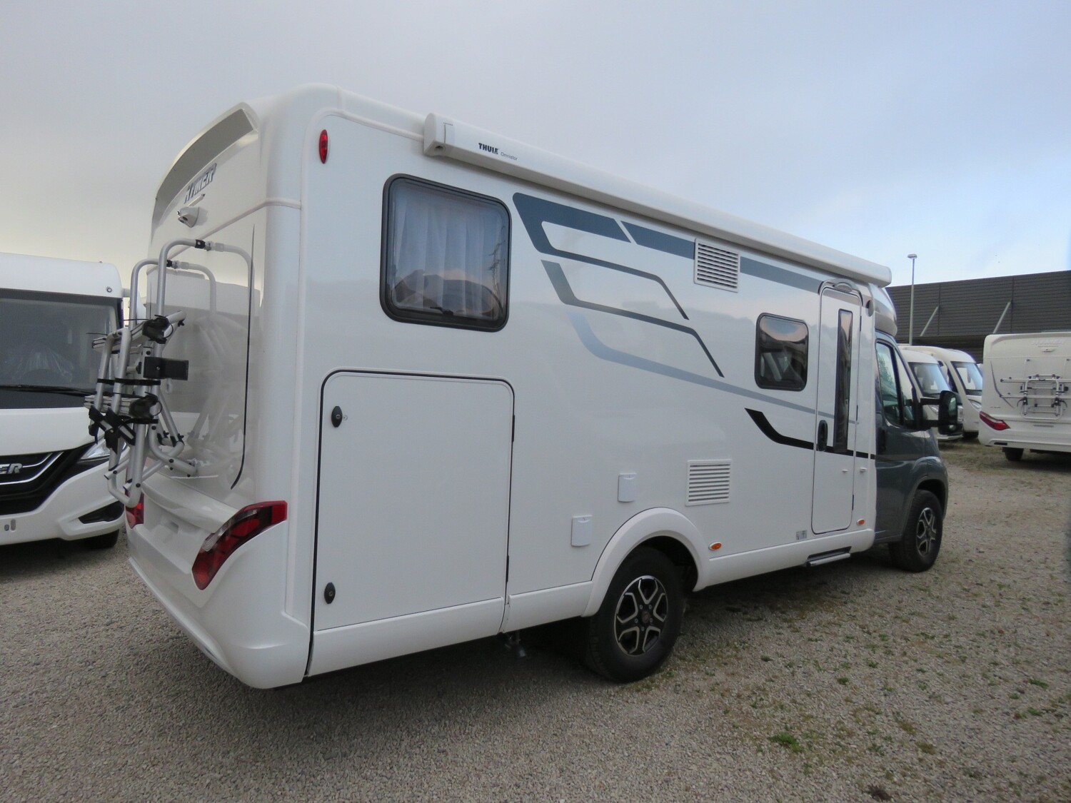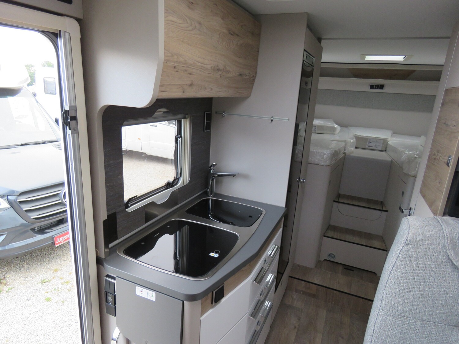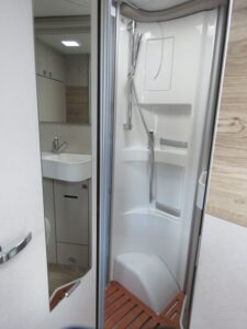 • Serienausstattung (Außenspiegel elektrisch verstell- und beheizbar, Kühlergrill-Rahmen Schwarz Glanz, Scheinwerfer mit schwarzem Rahmen, Schmutzfänger an Hinterachse, Spoiler in Wagenfarbe lackiert, LED-Tagfahrlicht, 16″ Leichtmetallräder (für Light-Chassis), Hinterachsstabilisator, Lenkrad und Schaltknauf in Leder, manuelle Klimaanlage mit Pollenfilter, ABS (Anti-Blockiersystem) / EBD (Elektronische Bremskraftverteilung), ESP inkl. ASR, Traction Plus und Hill Holder, Post-Kollision-Bremskontrolle, Seitenwindassistent, Start-Stop-System inkl. intelligenter Lichtmaschine, Tempomat Fiat Cruise Control, SKID-PLATE Schwarz Glanz, Aufbau: 60 cm Maxi – Komfort-Eingangstür inkl. Fenster mit Verdunkelung und Mülleimer, Markise mit Adapter, Gehäuse weiß oder silber, 400 x 250 cm, Garagenklappe in Fahrtrichtung links, 75 x 85 cm, Garagentraglast bis 350 kg (optional 450kg), GFK-Leichtbauboden mit XPS-Isolierung (Boden 41mm), große Garagentür in Fahrtrichtung rechts, Panoramadach über Fahrerhaus, manuell ausstellbar, HYMER Panorama-Kurbeldachlüfter 80 x 50 cm, doppeltverglast mit LED-Beleuchtung im Wohnraum, Faltverdunkelung für Fahrerhaus, Komfort L-Sitzgruppe mit Loungepolstern, längs-/quer verschiebbarem Tisch und 2 integrierten 3-Punkt-Gurten, multifunktionale ergonomische Möbelelemente, Bettenbau für Komfort L-Sitzgruppe inkl. Zusatzpolster und absenkbarem Tisch unter Einbeziehung des Fahrersitzes, Kaltschaummatratze inkl. hochwertige Matratzenunterlage (Gewirke) zur Belüftung im Heck, Zusatzpolster zwischen den Längseinzelbetten inkl. integrierter Komfortaufstieg, Ambiente-Beleuchtung, komplette LED-Innenbeleuchtung, LED-Thekenbeleuchtung, LED-Vorzeltleuchte, Küche: Küchen-Schubladen mit Soft-Close-Funktion und Besteckeinsatz, extra breite, 142 l Smart-Tower Kühlschrank, Badezimmer: Einlegeboden mit Holzoberfläche, Milchglas-Dachlüfter 40 x 40 cm mit Verdunkelungsrollo und Mückenschutz im Bad, Installation & Technik: 6 kW Gas-Warmluftheizung mit 10 l Warmwasserboiler, LCD-Bedienteil für die Heizung, automatische Gasflaschenumschaltanlage mit Crash Sensor und EisEx, Gasfilter für automatische Gasflaschenumschaltanlage, Gaskasten mit Zugang durch Außentüre/-klappe, 4 x 230 V / 1 x 12 V / 1 x Doppel-USB Zusatzsteckdosen (inkl. Küchenwand-Verkleidung), verstärkte Batterie 12 V 95 Ah AGM, 120 l Frischwassertank isoliert und beheizt (20 l in Fahrstellung), 90 l Abwassertank isoliert und beheizt, Multimedia: Radio-/TV-Vorbereitung inkl. 12 V und 230 V Steckdose, 2 Lautsprecher Fahrerhaus, 2 Lautsprecher im Alkoven, Radio- und DVB-T2 Antenne, Rückfahrkamera, 32″ Flachbildschirmhalter, 32″ Smart-LED-TV mit integrierten Lautsprechern, Fernbedienung, DVD-Laufwerk, (DVB-T/C, DVB-S2) inkl. Receiver, Satellitenantenne digital mit 65 cm Spiegel, Textilien & Dekore: Möbeldekor Sauvignon Oak (Tip Printed), Stoffkombination Korfu.)