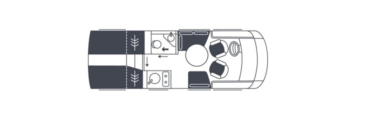 - Sofa Fahrerseite zur L-Sitzbank umbaubar (4 Gurtsitze gesamt), inkl. klappbarer Tischplatte und schiebbarem Tisch dank Bodenschienensystem