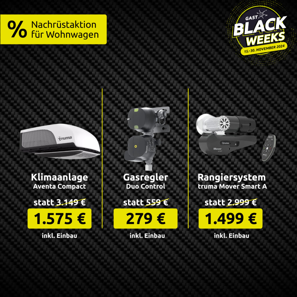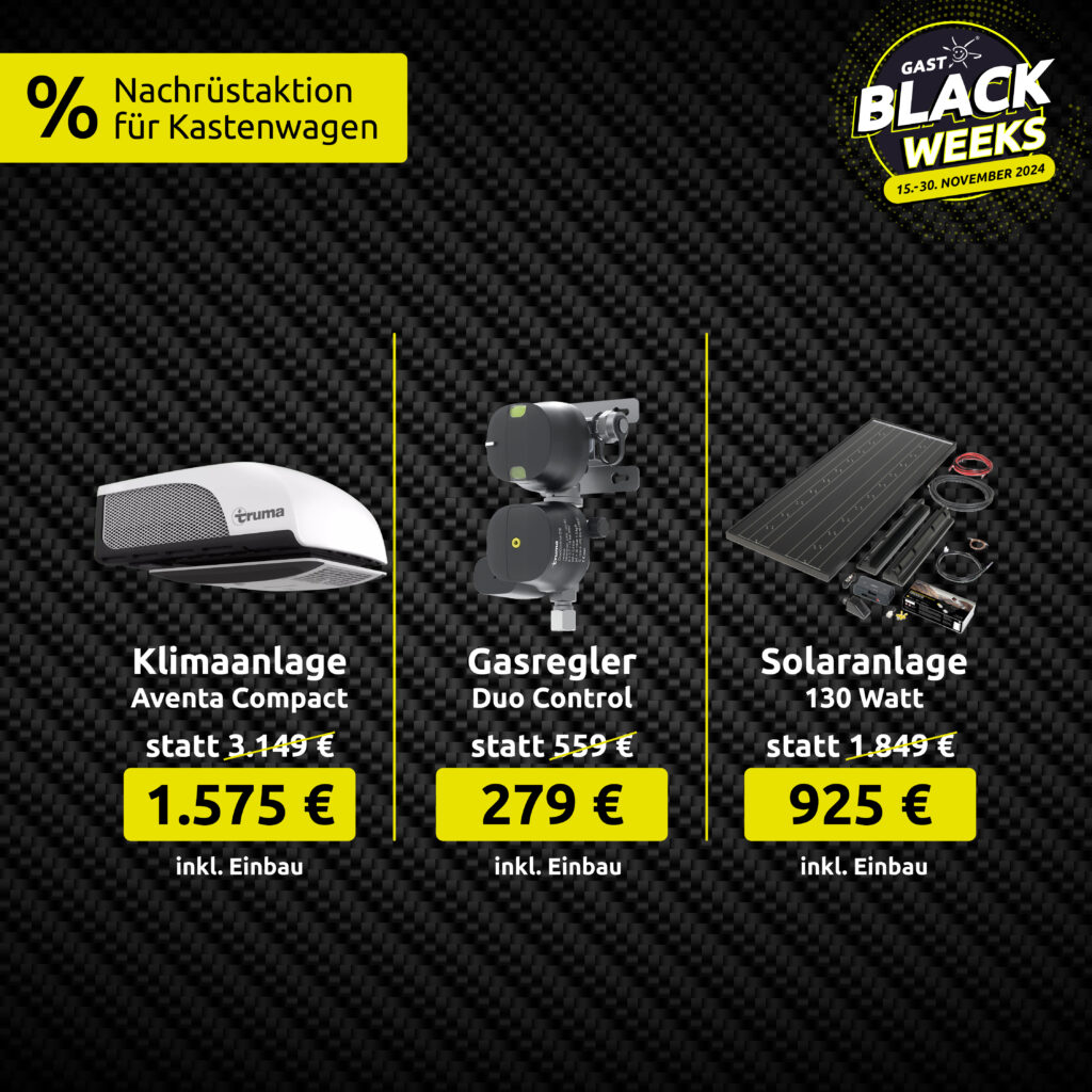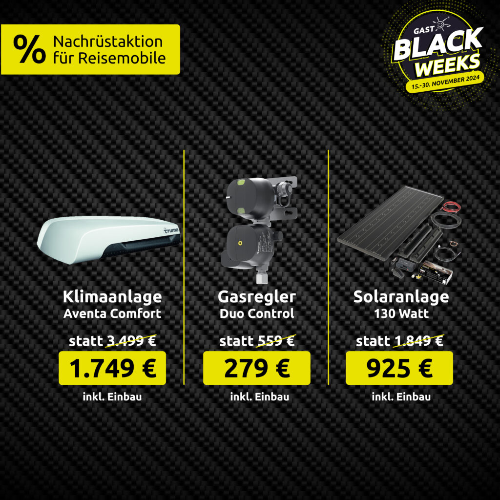Unsere eiskalten Black Week Angebote bereiten Sie auf den nächsten heißen Sommer vor: Nutzen Sie jetzt unsere Nachrüstaktion beim Kauf eines Neu- und Gebrauchtfahrzeugs rund um Klimaanlagen, Gasregler und Solaranlagen. Nur bis 30. November bieten wir attraktive Sonderkonditionen für Ihren Kastenwagen, Ihr Reisemobil oder Ihren Wohnwagen:
