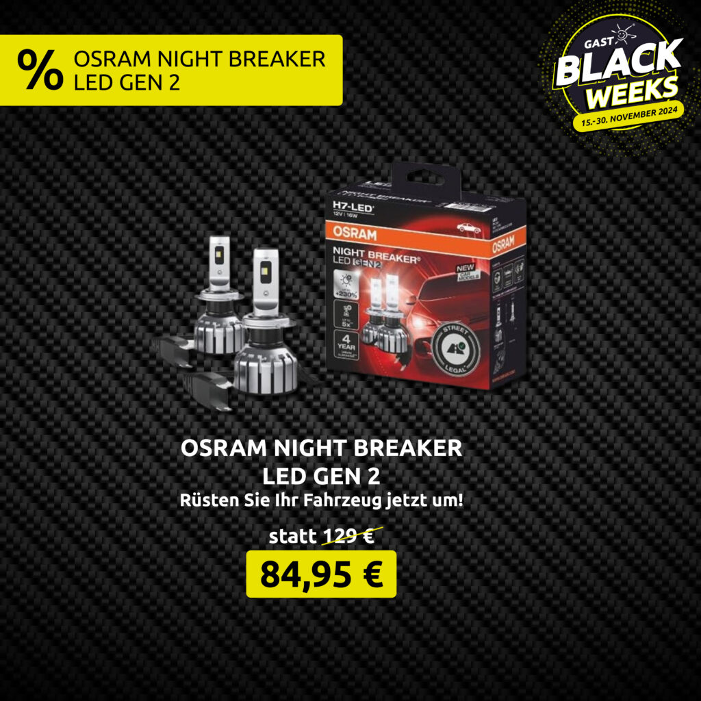 Und last but not least lassen wir Sie nicht im Dunkeln stehen. Mit der neuen NIGHT BREAKER LED GEN 2 kommt jetzt die nächste Generation der straßenzugelassenen LED-Nachrüstlampen von OSRAM auf den Markt. Die NIGHT BREAKER LED GEN 2 ist kompatibel mit herkömmlichen H7-Lampenfassungen und ermöglicht den unkomplizierten Wechsel auf modernste LED-Technologie für Abblend- und Fernlicht – jetzt bei noch mehr Fahrzeugmodellen.
